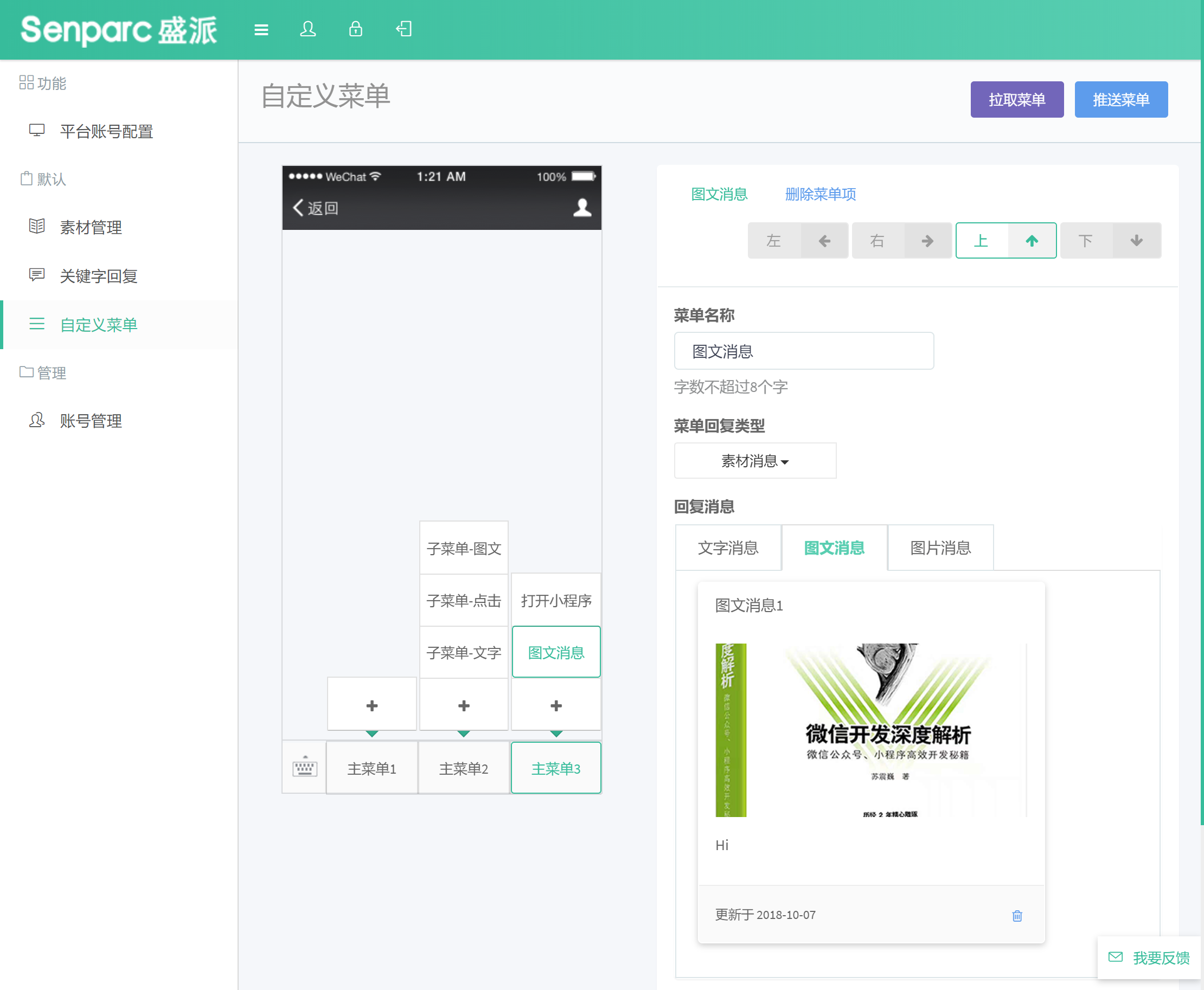 NeuChar 为微信菜单提供免费的设置、储存和素材管理服务,您可以尽情享用。